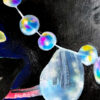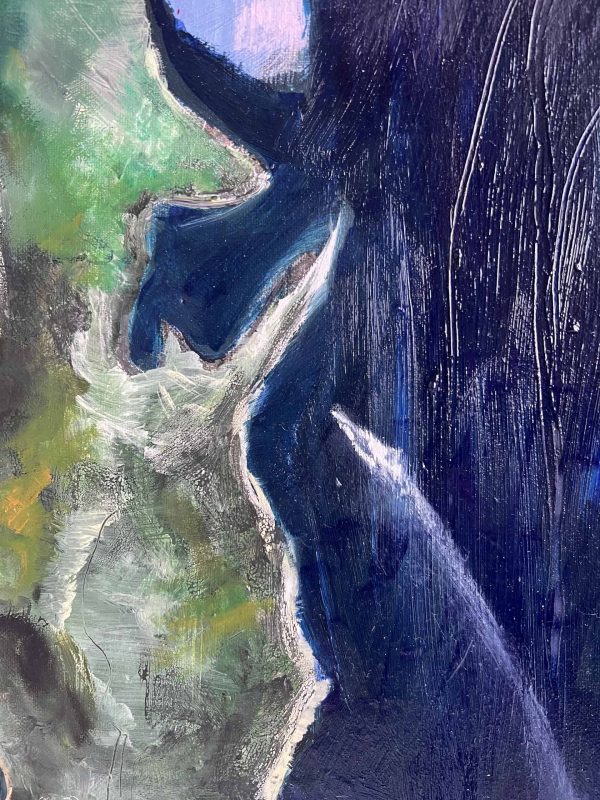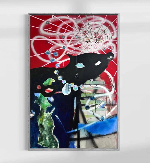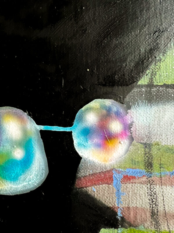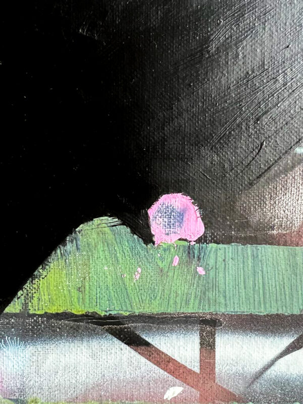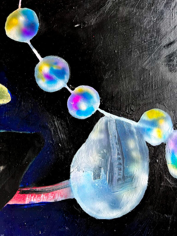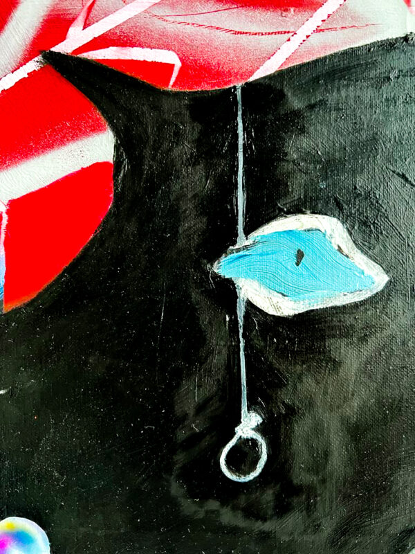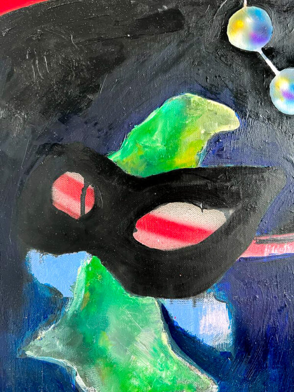 Scattered throughout are subtle hints of a metamorphosis from cat to spider, symbolizing intelligence, beauty, and death. A ball of yarn, recently played with by the cat, becomes a spider’s web, with a hidden spider subtly implied. This can be interpreted as a reflection on the duality and ambivalence of the human condition.Dewdrops have formed on a fine thread, one of which reflects the city of cats (a symbol for derealization states), distorted in perspective. The other end of the thread, depending on one’s perception, conditioning, and imagination, becomes either a gallows or a ring.