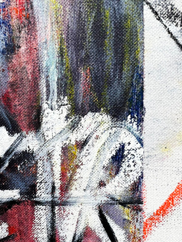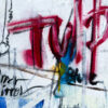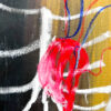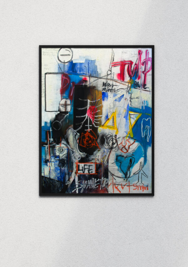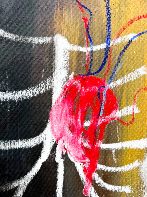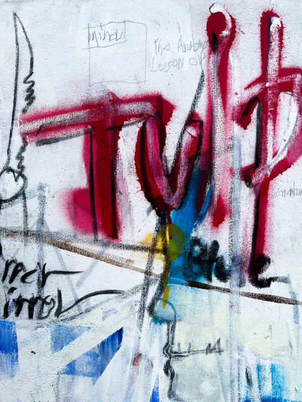 acrylic, charcoal, spray paint and oil pastels on stretched canvas