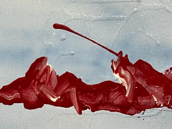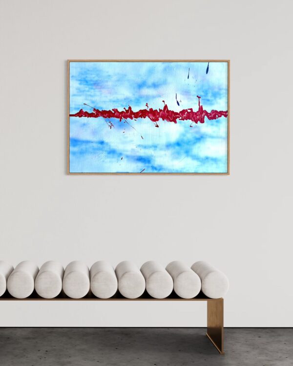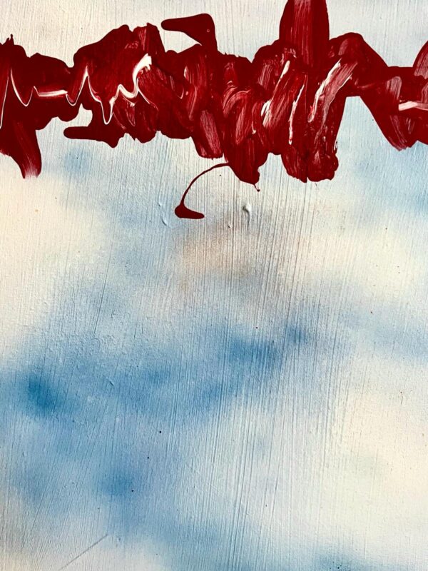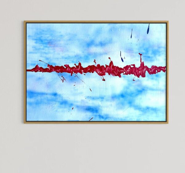 Die expressive, kraftvolle rote Linie könnten ebenfalls als Manifestation von Lebenskraft, Energie oder sogar spiritueller Kraft interpretiert werden. Die pulsierende Qualität könnte auf den Rhythmus des Lebens oder den Herzschlag der Existenz hinweisen. Rot als Farbe wird oft mit Leidenschaft, Liebe, aber auch mit spirituellen Erfahrungen in Verbindung gebracht.